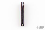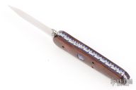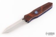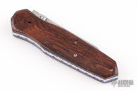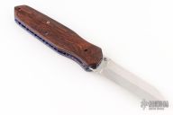 This Linerlock by Nate Clark features a mirror polished blade with false top edge, fileworked thumbrest and a single thumbstud with abalone inlay. The handle has desert ironwood scales, abalone inset in the fileworked and anodized titanium push button, fileworked anodized titanium liners with jeweled interiors, fileworked stainless steel backspacer. This knife started as an automatic, but the spring is broken, so it is now just a Linerlock, otherwise good condition.