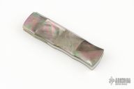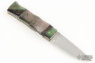 This linerlock folder by Koji Hara features a mirror polished blade with a black lip pearl inlaid thumb stud. The handle has black lip pearl scales with nickel silver spacers and liners, stainless steel locking liner, stainless steel backspacer. Nice blade seating, lockup and detent. Comes with a leather pouch. Excellent condition.
