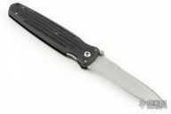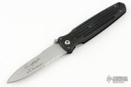 This Applegate Fairbairn Combat Folder by Gerber has a bead blasted stainless steel partially serrated spear point blade with dual thumb studs and sharpened top edge. Handle is black contoured polymer with single stainless steel liner and lanyard hole. Has been sharpened, otherwise excellent condition. Comes with original sheath.