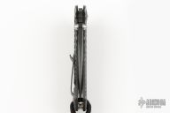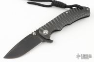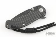 This Tango II Framelock Flipper by Tim Britton has a black finished blade with dual thumbstuds, notched thumbrest, and flipper. The handle has a contoured titanium frame with tip up/down reversible clip, lockbar stabilizer, titanium barrel spacers, and lanyard hole. Comes with a zippered case. Has a couple light scuffs, otherwise Excellent condition.