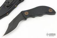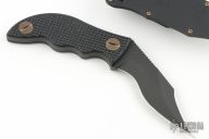 The handle scales are CNC textured black G10 and are affixed to the skeletonized full tang with our custom 17-4 stainless hardened hardware. Our in-house made hardware is removable using a penny allowing for storage under the scales and field maintenance without special tools.