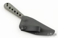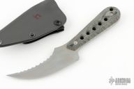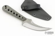 This Rhino by Steve Ryan features a satin finished upswept chisel ground blade with a sharpened and serrated top edge and notched thumbrest, .144" blade stock and 1.445" blade depth, full tang construction with sculpted pattern black canvas micarta scales. Comes with a kydex sheath with belt loop. Has a couple light scuffs, excellent condition otherwise.