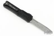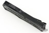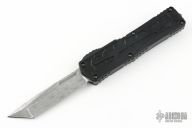 This Colossus by Heretic Knives features a Vegas Forge Damascus Tanto blade with fullers and notched thumbrest. The handle has a black aluminum frame with beautiful seamless black ostrich inlays, checkered thumb slide, black stainless steel tip down clip. Comes with the original box and papers. S/N 036. Excellent condition.