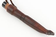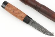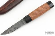 This Puukko by Dennis Jensen features a Zoe Crist Damascus blade with .112" blade stock and .811" blade depth, hidden tang construction. The handle has ebony wood guard and butt with a stacked birch bark grip. Comes with a brown leather sheath. Excellent condition.