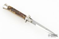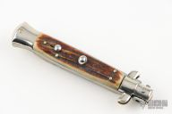 This PickLock features a polished bayonet ground blade with false top edge. The handle has nickel silver bolsters, front and rear, stag scales, brass liners, stainless spring. Has a few scuffs/scratches otherwise the knife is in excellent condition.