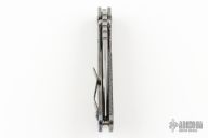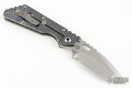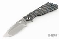 This Mick Strider Performance Series XL framelock folder features a hand ground stonewashed blade with thumbhole and notched thumbrest. The handle has a flamed and orange peel finished titanium frame with titanium clip, tip up carry. Jimping on blade spine. Includes Hinderer "Lock Bar Stabilizer" for maximum reverse lock retention. Nice detent, lockup and blade seating. New condition.