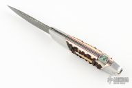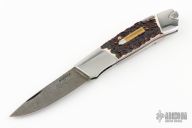 Carbon Damascus Back-Lock Folder, Rugged Lock back Folder with Genuine Sambar Stag handle with Brass/Nickel silver Bullet inlay, Hand rounded integral one-piece mirror polished stainless steel bolsters/liners with Stainless steel lanyard shackle on end, Hand filed back spring bar with Abalone inlaid Stainless steel lock release button, 3" Black Carbon Damascus blade with Nail-nick and file work on back, 4-1/4" Mirror polished integral solid Stainless steel handle, Comes with Black velvet cloth pouch and hand-made Ho-wood box.