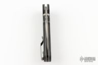 This Pat Crawford Carnivore features a satin clip point blade with recurve, dual thumbstuds. The handle has black scales, bead blasted titanium liners, stainless steel tip up pocket clip and black backspacer. Has solid lockup. Comes with a Crawford knives nylon belt sheath. Has some light scuffs and scratches, great condition otherwise.