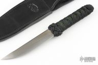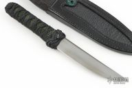 This Tanto by Steve Isbell features a hand rub satin finished tanto blade with light hamon, .189" blade stock and 1.001" blade depth, hidden tang construction. The handle has black cord wrap over black green ray skin. Comes with black leather sheath with broken snap. Also includes a zipper case. Has some scratches and patina, great condition otherwise.