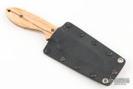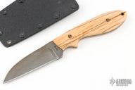 This Skinner from Ricky Fowler features a black finished blade with .125" blade stock and .993" blade depth, full tang construction. The handle has mammoth ivory scales with mosaic pins and lanyard tube. Comes with a Kydex sheath. Has a couple light scuffs, great condition otherwise.