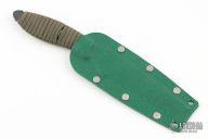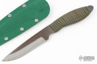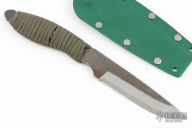 This Muteki Knife by Murray Carter features a spear point blade with hammer finished flats and satin finished grinds, .118" blade stock and .929" blade depth, full tang construction with green cord wrapped handle. Comes with green Kydex sheath. Has some light scratches, otherwise excellent condition.