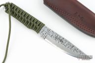 Aggressive Outdoor Hunter has the unique Tsuchime hammered textured, Hitachi Shirogami No.2 ( White steel No.2 ) SAN-MAI blade 5" Clip Point blade, and a forged Integral Handle, which is decorated with a matching Moss Green Color Paracord wrap and lanyard. A handcrafted leather sheath, which has a belt loop is included with the knife. The unique Tsuchime hammered texture of traditional forged blade Hunting knife is produced with the concept of practicality and powerful and wildness.