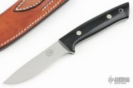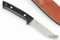 NOBUAKI YAMAMOTO  Drop point Hunter,   Easy-to-grip Lightweight Skinner and Utility Hunter!  4" VG-10 Highly Mirror polished Hamaguri-ba blade, 4-3/4" Hand contoured Black Micarta handle with lanyard hole on end, Full tang with 2 Brass rivets, Comes with custom made Brown Leather sheath.