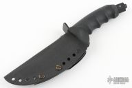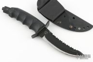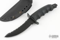 This Hobbit Warrior by REKAT features a black .160" blade stock. 1.207" blade depth. Serrated top edge. Double guard. Rubber handle. Black coated butt cap. Has been resharpened otherwise the knife is excellent condition.