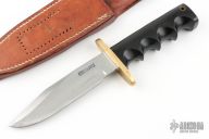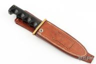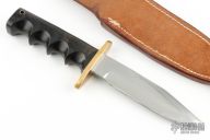 This Model 15 Airman by Randall Made Knives features a clip point blade with a sharpened top edge, .230" blade stock. 1.2225" blade depth, full tang construction. The handle has black linen micarta handle with finger grips and a brass guard. The Model 15 is designed especially for heavy-duty use and to be as nearly indestructible as possible. Comes with a brown leather rough back sheath. Has been resharpened. The sheath is not in the best condition. Has scuffs and scratches otherwise the knife is in good condition.