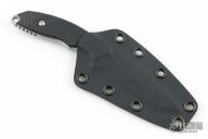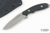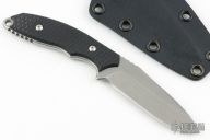 This Custom Flashpoint by Rick Hinderer features a drop point blade with notched thumbrest, .155" blade thickness and .9" blade depth, full tang construction. The handle has textured black G-10 scales. Includes Kydex sheath. Excellent condition.