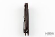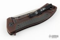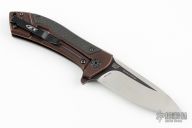This 0801CF Rexford Limited Edition Copperhead Flipper #0045 has a two-tone satin and black M390 stainless steel drop/spear point blade. Handle is anodized titanium with carbon fiber overlays, black finished stainless steel tip up (RH/LH) clip, and lanyard hole. Very nice work. Has a couple light scuffs, excellent condition otherwise.