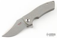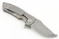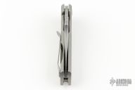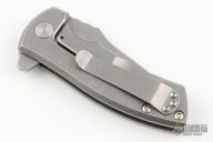 This ESV Flipper by Les George features a tumble finished Magnacut blade with notched thumbrest and a flipper. The handle has a stonewashed titanium frame and titanium pocket clip for tip up carry. Smooth function with a lock up and nice detent. Comes with a zippered case. New condition.