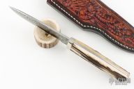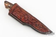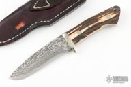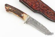 This Drop point Hunter features 4-1/2" Drop point R2 Damascus blade, 4-1/2" Hand contoured Genuine Stag handle with Nickel silver Hilt and Rivets. Full tapered tang with stainless tubular lanyard hole on end, Comes with hand fitted Leather sheath with belt loop and Carabineer belt hook