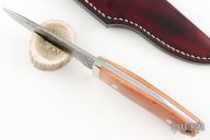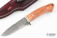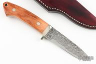 This Drop point Hunter features Drop point R2 Damascus blade, Hand contoured Brown Camelbone handle with Nickel silver Hilt and Rivets. Full tapered tang with stainless tubular lanyard hole on end, Comes with hand fitted Leather sheath with belt loop.