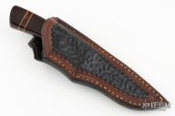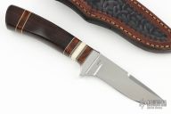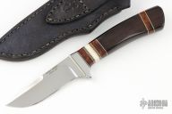This Hunter by Alan C Warren features a hand rub satin finished drop point blade with false top edge, .142" blade stock and 1.019" blade depth, hidden tang construction. The handle has a 416 stainless steel guard, blackwood and ironwood grip, and black/nickel silver/ironwood/brass/walrus ivory spacers. Comes with hand tooled brown/black leather sheath. Excellent condition. #2363