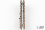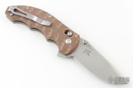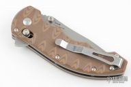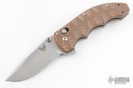 This Axis Lock flipper is a Ball Custom Knives Design executed by Benchmade. The tumble finished clip point blade has a swedge, dual thumb studs, notched thumbrest and flipper. The handle is comprised of sculpted tan and brown G10 scales over skeletonized steel liners and standoffs. AXIS locking mechanism. Comes with original box, drawstring pouch, and papers. Excellent condition.
