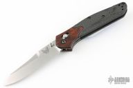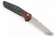 This Limited edition Osborne AXIS lock by Benchmade has a stonewashed drop point blade with dual thumbstuds. The handle features wood bolsters and carbon fiber scales with a black steel tip up pocket clip. Includes the original box, drawstring pouch and papers. Excellent Condition.