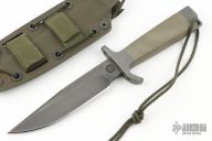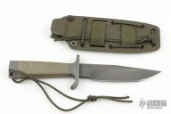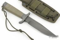 The Mk43 Navy features a clip point blade made from 5160 carbon steel with a non-reflective Parkerized finish. Reminiscent of the classic Mark 2 Navy combat knife, the Mk43 pays homage to its roots while being a modern improvement in every aspect. A choil just in front of the guard allows the user to choke up on the knife for fine detail work. The Parkerized manganese phosphate finish (MIL-STD 171) provides rust resistance with a sturdy non-reflective finish. A 25 degree edge bevel ensures a strong and durable cutting edge. The double hilt steel guard protects fingers while in use, and features lashing points on both sides of the guard. The pommel is formed from case hardened steel and features a conical glass breaker, lanyard hole & lock screw. The hidden tang handle is green G-10 that has been machined to not roll in the hand. The Mk43 is built combat-tough to withstand the rigors of extended field use and comes with a Lifetime Warranty and extended service. Accompanied by a MOLLE compatible Kydex sheath. The Mk43 is made with all American-made components & materials. Made in Nampa, ID, USA.