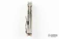 This DCG BBNM Framelock Folder has a gunmetal finished blade with a thumbhole. Handle has a Texas Flag titanium frame and tip up clip, and titanium barrel spacers, custom black hardware. Centered blade and great lockup and detent with zero blade play. Comes with velcro case and COA. Excellent condition.