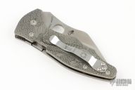 This Yojimbo 2 by Spyderco features a satin finished wharncliffe blade with thumbhole. The handle has a stonewashed titanium frame with laser engraving, stainless steel liners, lock is on the spine of handle, stainless steel clip. Nice detent, lockup and blade seating. Comes with original box, G-10 scales and papers. Excellent conidtion.