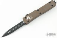 This UTX-70 OTF automatic by Microtech features a black finished blade with a standard edges. The handle has a brown aluminum frame with black stainless steel tip down clip. Serial number 30325 and dated 01/2016. Comes with original box and papers. Excellent condition.