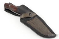 This Fatty Fighter by Koenscraft features a blued saber ground blade with sharpened top edge, .312" blade stock and 2.169" blade depth, full tang construction. The handle has bocote wood scales. Comes with a black leather sheath with rhino leather inlay by Nixon Leather. Has a couple light scratches, otherwise excellent condition.