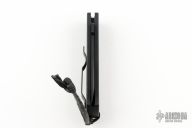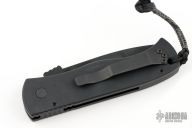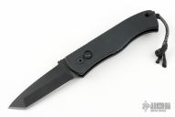 This Emerson/Pro-Tech CQC7 automatic has a chisel ground black sterile blade with a plain edge and a solid black aluminum handle with a tritium push button insert.  Black stainless steel clip. Coil spring. Comes with original box and papers. Has some light scuffs and scratches, great condition otherwise.