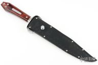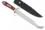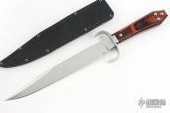 This is a discontinued Bill Bagwell designed Bowie, made by Ontario Knife, features a mirror finished blade with a nearly sharpened top edge, .295" blade stock and 1.349" blade depth, hidden tang construction. The handle has a stainless steel guard, wooden coffin shaped handle with name plate. Comes with original black leather sheath, box and papers. Excellent condition.