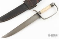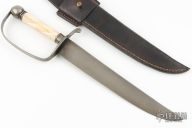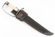 This Cut Down Hanger Sword by Swamp Fox features a hand forged blade with a hand rub satin finish and light bluing, .225" blade stock and 1..385" blade depth, hidden tang construction. The handle has a forged steel guard, fluted steel collar and butt, spiral fluted bone grip. Comes with black leather sheath with frog. Has a few light scratches, otherwise excellent condition.