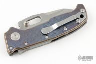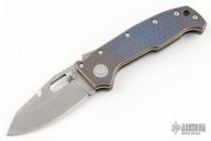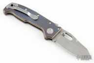 This AD20 by Andrew Demko features a stonewash finished machine ground blade with notched thumbrest, thumbhole and dual titanium thumbstuds.  The handle has an anodized and laser engraved smooth titanium frame with a tip up stainless steel clip and "Shark" lock release on the spine. Comes with original box. Excellent condition.