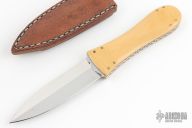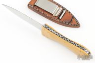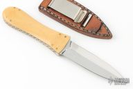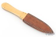This Boot Dagger by Fred Carter features a double-edged mirror finished blade, full tang construction with .181" blade stock and .978" blade depth. The handle has yellow paper micarta scales with brass pins, fileworked tang. Comes with a brown leather sheath with boot clip. Has a couple very light scratches, otherwise excellent condition.