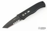 This Emerson/Pro-Tech CQC7 automatic has a chisel ground black tanto blade with a partially serrated edge and a black knurled aluminum handle. Black stainless steel clip, tip up or down reversible. Coil spring. Comes with original sheath. Excellent condition. PR5 #404