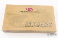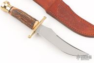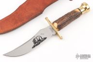 This Kodiak Bowie from Case Knives features an upswept mirror polished blade with false top edge. Kodiak Bear Etching on presentation side. The handle is comprised of brass double guard and pommel with stag handle over hidden tang construction. Includes original box, and hand tooled brown leather sheath with belt loop.