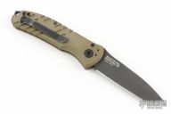 This Tanto by Gerber features a partially serrated black coated blade with push button and safety. The handle has milled green G-10 scales and a 3-way stainless steel clip. Has some light scuffs and scratches, otherwise excellent condition.