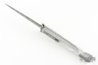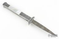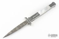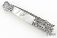 This Swing Guard Auto by Afaaq Custom Knives features a mosaic Damascus blade with a false top edge. The handle has engraved stainless steel bolsters, fileworked stainless steel liners, mother of pearl scales, fileworked stainless steel backspacer. Comes with a leather case. New from maker!