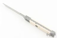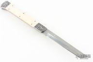This Tab Lock Auto by Afaaq Custom Knives features a satin finished tanto blade with a false top edge and fileworked spine. The handle has engraved stainless steel bolsters, fileworked stainless steel liners, bone scales, fileworked stainless steel backspacer. Comes with a leather case. New from maker!