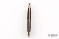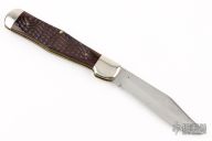 This Coke bottle folder by Case knives has a mirror polished blade with nail nick. The handle has nickel silver double bolsters, jigged wood covers, brass liners, steel spring. Has half stop, flush in all positions. Has some scuffs, scratches, and patina. Great condition otherwise.