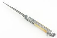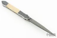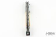 This Tab Lock Auto by Afaaq Custom Knives features a Stainless San Mai Damascus blade with a false top edge. The handle has engraved stainless steel bolsters, fileworked stainless steel liners, gold lip pearl scales, fileworked stainless steel backspacer. Comes with a leather case. New from maker!