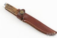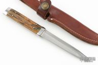This Handarbeit boot knife by Puma features a high polished tumbled blade with false top edge, .151" blade stock and .703" blade depth at the ricasso, integral construction. The handle has integral bolsters, front and rear with stag scales. Comes with leather belt sheath. Has scuffs, scratches, and some marks. Has been resharpened, good condition otherwise.