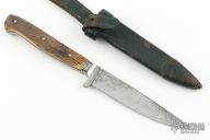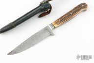 This Bayernmesser by Puma features a satin finished clip point blade with serrations, integral fluted guard, .180" blade stock and .812" blade depth at the ricasso. The handle has stag scales with nickel silver pins and tapered tang. Comes with leather belt sheath. Has patina, scuffs and scratches, great condition otherwise.