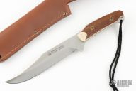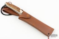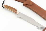 This Bowie II by Puma features a satin finished blade with false top edge, .156" blade stock and 1.152" blade depth, full tang construction. The handle has stag scales and a lanyard hole at the butt. Comes with brown leather sheath. Excellent condition.