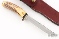 This knife from Case Knives features a mirror finished blade with a notched thumb rest, false top edge and fullers, .105" blade stock and .682" blade depth, full tang construction. The handle has a brass guard and brass pommel with stag scales. Includes original brown leather sheath. Has a couple light scratches, otherwise excellent condition.
