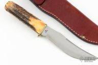 This Hunter from Case Knives features a mirror polished blade with false top edge and notched thumbrest, .113" blade stock and 1.074" blade depth, hidden tang construction. The handle has a brass guard and pommel with stag handle. Includes original brown leather sheath. Has some light scuffs and scratches, otherwise excellent condition.