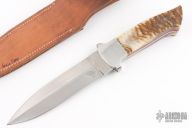 This knife by Ralph Smith features a satin finished double-edged blade with a tapered tang construction.  The handle features steel dovetailed bolsters and horn scales over red liners.  Includes a brown leather sheath with a clip.  Light scratches are visible on the bolsters otherwise the knife is in excellent condition.